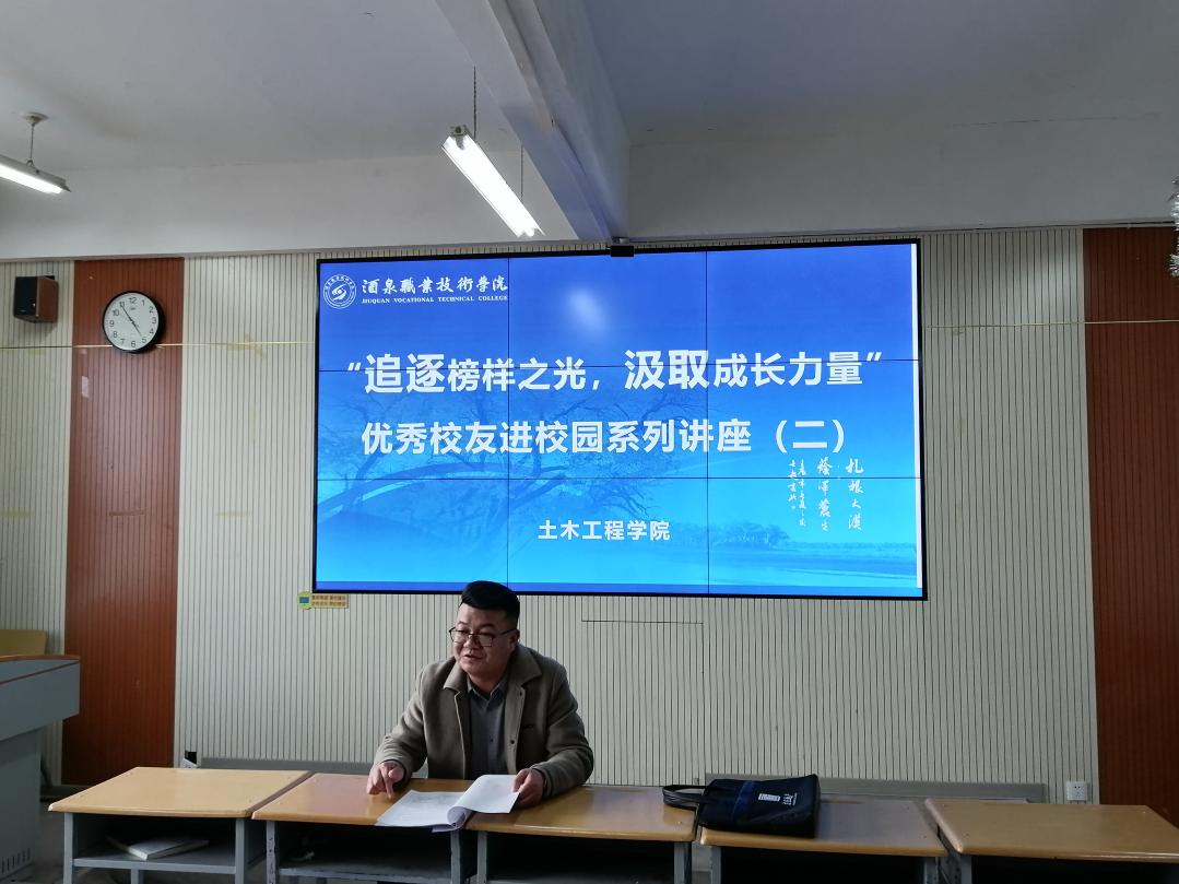 为加强学院与校友之间的联系,帮助在校学子提振专业学习信心,彰显优秀校友的榜样力量,2024年12月27日下午,土木工程学院在弘毅楼闻道厅、行知楼208教室开展了“追逐榜样之光,汲取成长力量”优秀校友进校园系列活动。甘肃省天脉建设工程咨询有限公司总经理李永亮、甘肃润峰顺建筑工程有限公司项目经理高祥两位优秀校友应邀来学院参加活动。