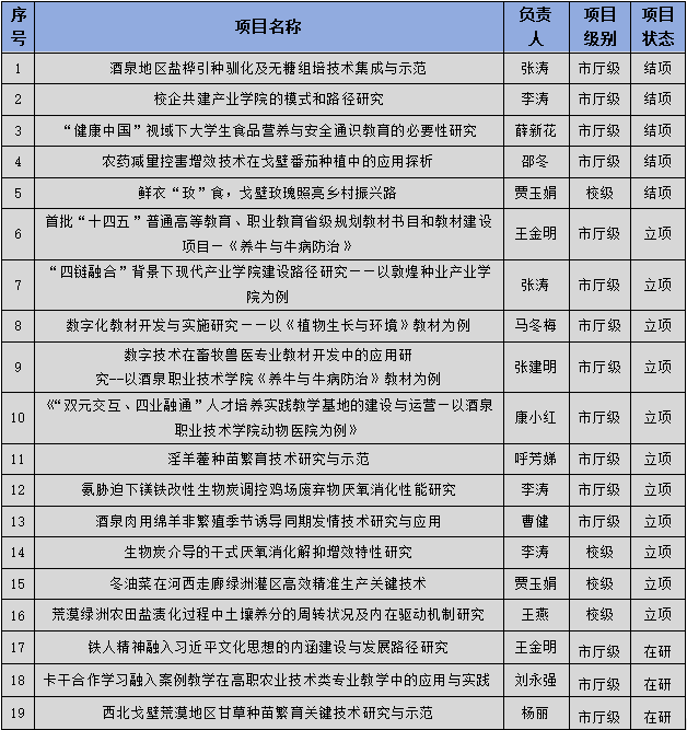 课题立项方面:在现代农业技术教师教学创新团队和学院博士团队引领下,依托项目带动科研工作提质增效,推动科研成果转化为教学资源,以高水平科学研究支撑创新人才培养。本年度教师结项市厅级教科研项目4项、校级科研项目1项;立项市厅级科研项目8项、校级科研项目3项,争取项目经费11.9万元;参与实施《洋葱种质创新及新品种示范基地建设》《利用智能人工气候室一年2-3代菠菜新品种选育研究与示范》等重大科技项目2项。