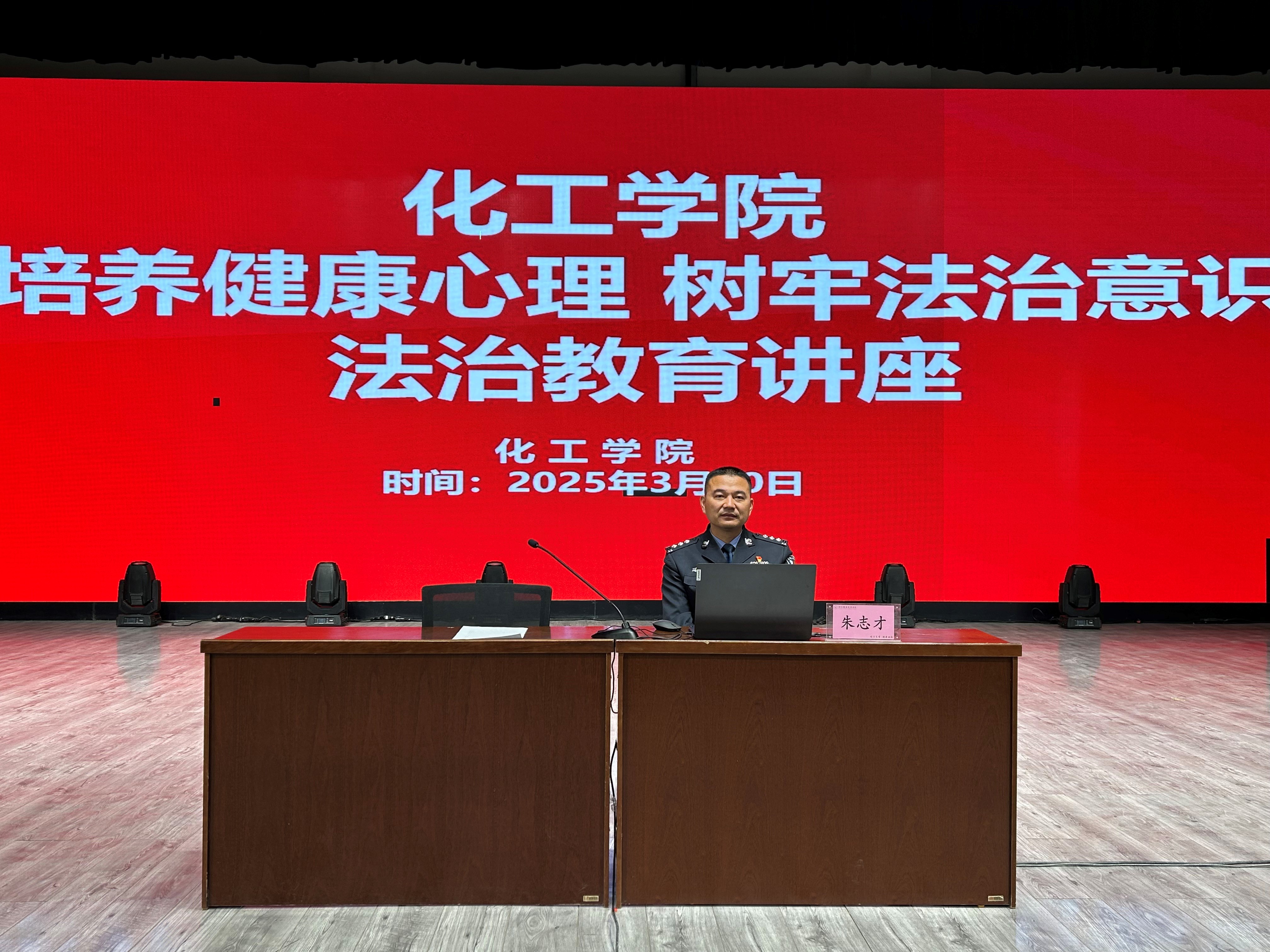 为进一步加强学生心理健康教育,树牢法治意识,营造安全、包容、友善的校园环境,3月21日晚上,化工学院特邀酒泉监狱监察室主任、一级警长、化工学院法治辅导员朱志才警官来校,在大学生活动中心为化工学院2024级全体学生带来了一场题为“培养健康心理、树牢法治意识、营造安全包容友善校园”的专题讲座。