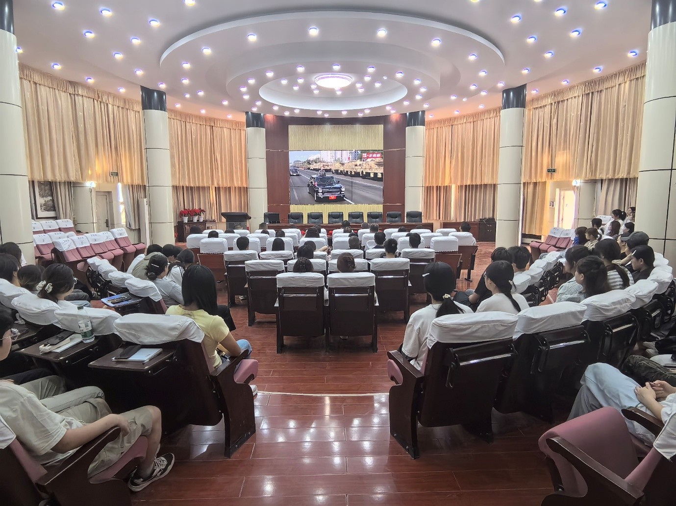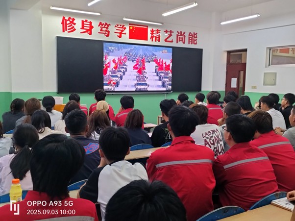 9月3日9:00,化工学院组织全体无课师生,在逸夫报告厅和教室集中观看纪念中国人民抗日战争暨世界反法西斯战争胜利80周年阅兵仪式。