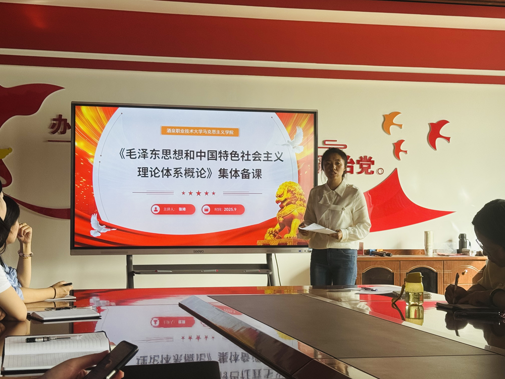 院系动态 > 正文2025年9月2日,酒泉职业技术大学马克思主义学院在208会议室举行“毛泽东思想和中国特色社会主义理论体系概论”课程导论部分集体备课会。本次备课会由我院张琦老师主讲,学院全体思想政治理论课教师参与研讨,旨在深入理解和把握新教材的指导思想与核心内容,进一步提升教学质量与效果。