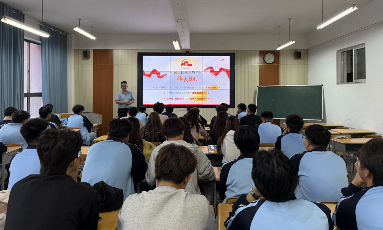 本次活动采取“领导带头、全员参与”的组织方式,学院领导班子成员分别深入对应联系的系部和班级开展讲授,其余班级由班主任同步组织授课。授课教师围绕“铭记历史 正义必胜”“民族壮举 浓墨重彩”“精神丰碑 永不磨灭”“珍爱和平 开创未来”四大核心篇章,借助丰富的历史资料、珍贵的影像记录和感人的抗战故事,多角度深情回顾了中华民族在烽火岁月中表现出的巨大勇气与牺牲精神,深刻阐释了伟大抗战精神的时代内涵与现实意义,并引导学生深入思考如何在新时代继承和弘扬这一宝贵精神,将爱国之情转化为刻苦学习、报效祖国的自觉行动。