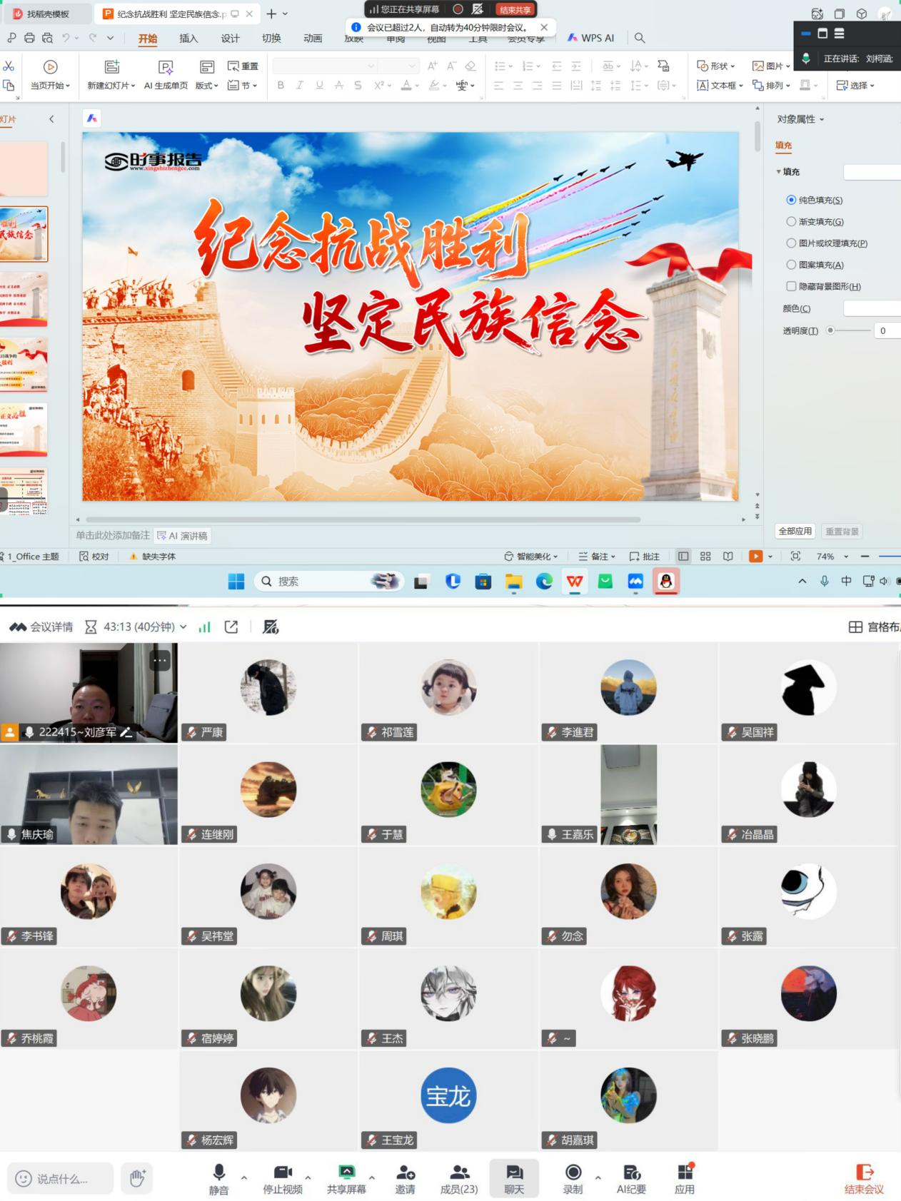 为深入学习贯彻习近平总书记关于弘扬伟大抗战精神的重要论述,引导广大师生铭记历史、缅怀先烈,厚植爱国主义情怀,9月4日晚,土木工程学院组织开展了以“纪念抗战胜利,坚定民族信念”为主题的“同上一堂思政课”活动。全院学生通过线上与线下相结合的方式,共同聆听了这堂深刻而富有意义的思政大课。