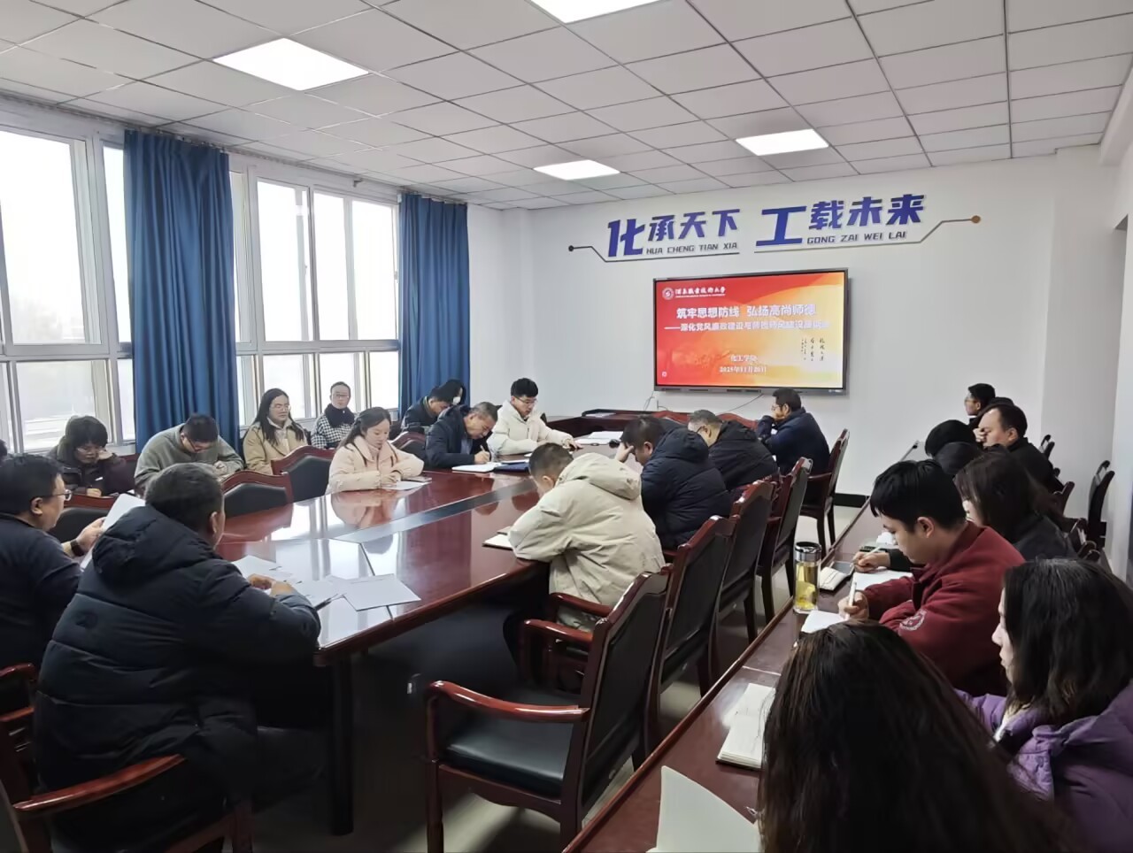 会议伊始,白锦川介绍了会议背景与核心目的,强调加强党风廉政和师德师风建设对落实立德树人根本任务的重要意义。随后,学院院长孔祥波带领全体教师学习上级党风廉政建设最新指示精神并通报典型案例,教学副院长任小娜领学《新时代高校教师职业行为十项准则》及相关文件精神。