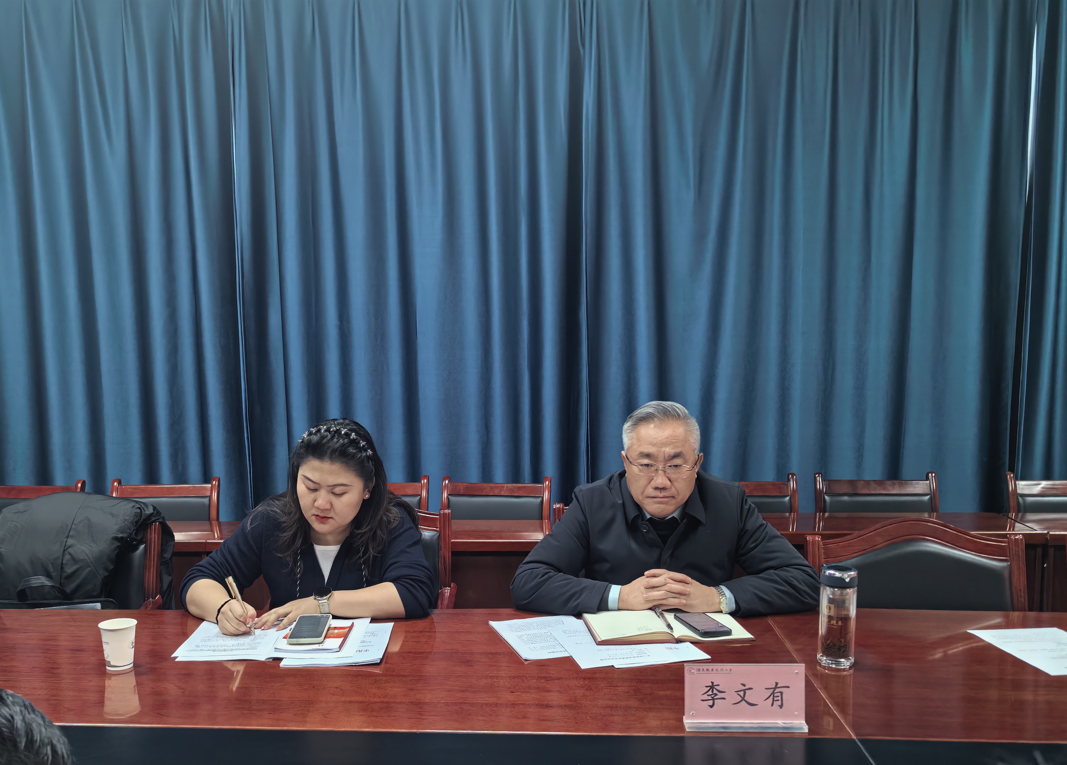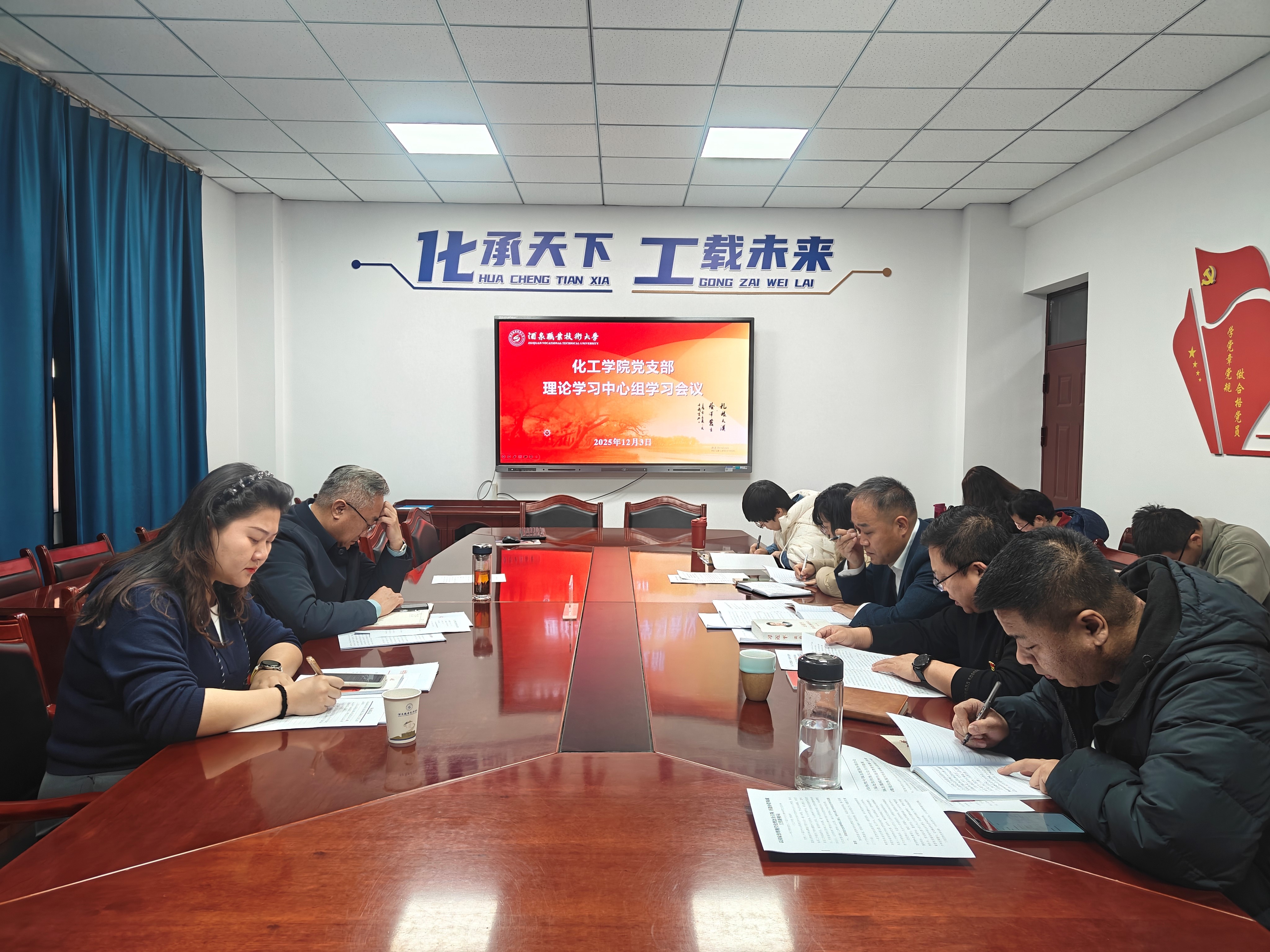 2025年12月3日,化工学院党支部召开理论学习中心组专题学习会暨党的二十届四中全会精神专题研讨会。学校党委列席旁听暨专题调研工作组第十一组组长、党委委员、宣传统战部部长李文有一行列席旁听。化工学院党支部书记白锦川主持会议,全体支委班子成员参加,各系(室)负责人列席会议。